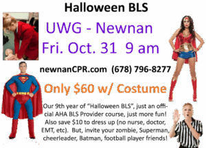 Yes, this is Newnan CPR & AED’s 9th time to do Halloween BLS, candy, prizes for best costume, you still get same day certification eCard! https://newnanCPR.com/schedule/halloween-bls-2025-10-31-uwg/